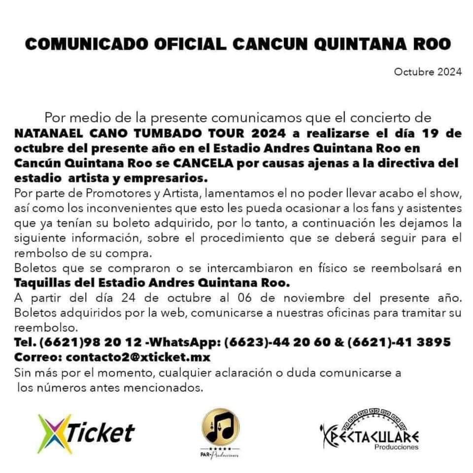 NATANAEL CANO TUMBADO TOUR 2024 a realizarse el día 19 de octubre del presente año en el Estadio Andrés Quintana Roo en Cancún Quintana Roo se CANCELA por causas ajenas a la directiva del estadio, artista y empresarios.